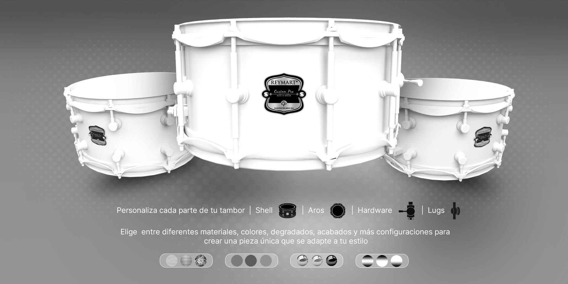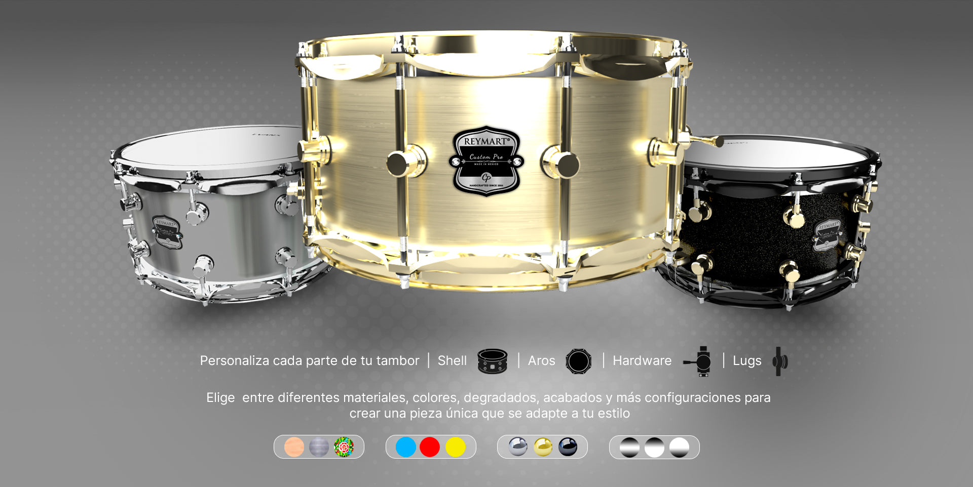 Disponibles en acero, aluminio y latón, seleccionados por sus excelentes propiedades acústicas. Cada tarola se fabrica con láminas de 2.7 mm de grosor, garantizando un sonido potente y duradero.
