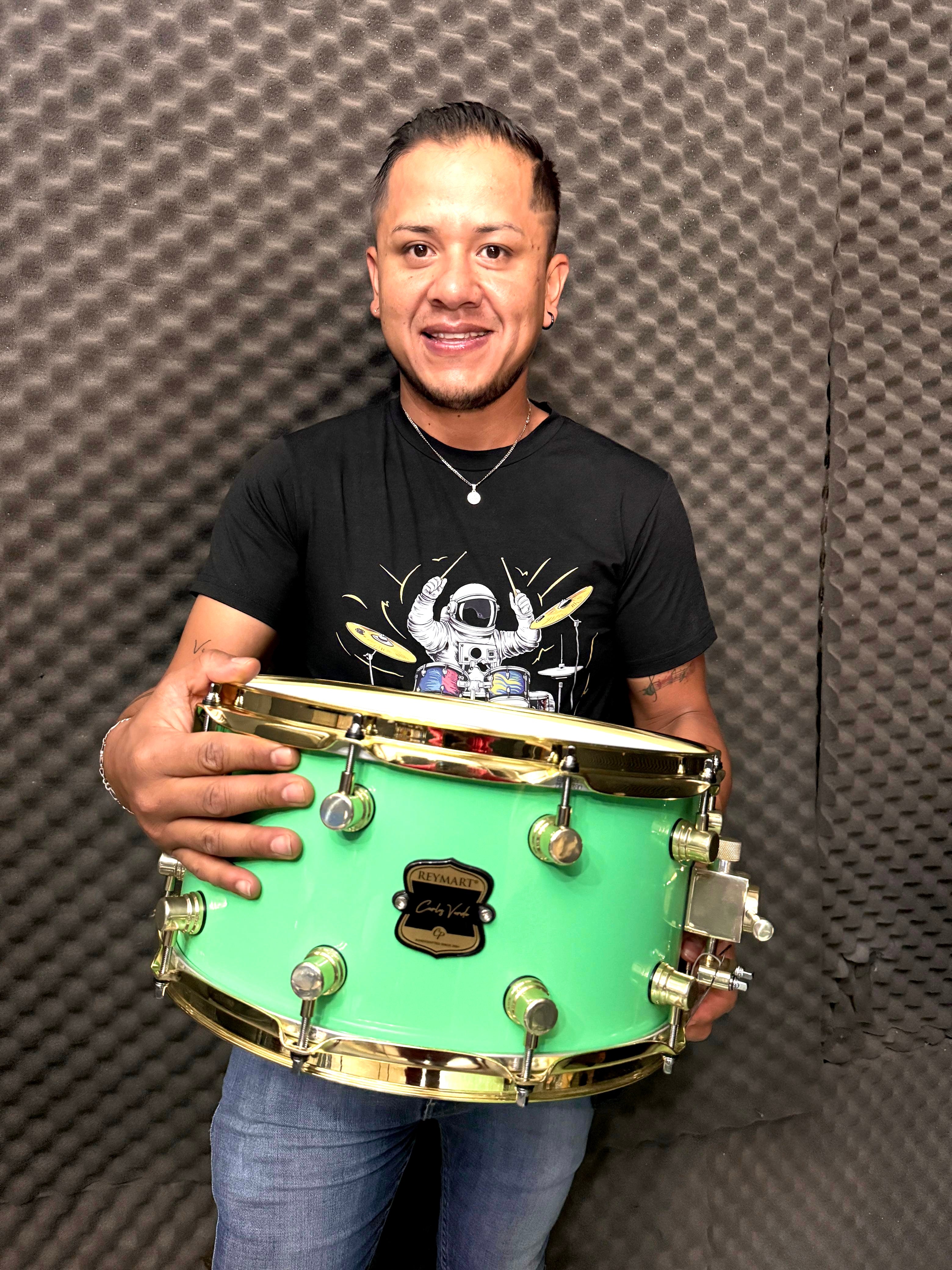 En 2025, Carlos Verde se unió a la familia Reymart®, gracias a la recomendación de nuestro amigo Charly Rosales, con quien tomaba clases de batería. Fue en una de esas sesiones donde Carlitos tuvo la oportunidad de probar la tarola de Charly y, convencido de su sonido y potencia, decidió que era la opción perfecta para el norteño.