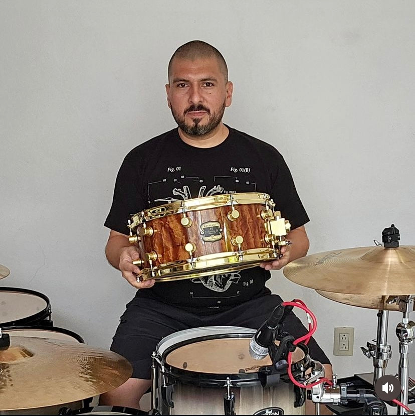 Saúl se unió a la familia Reymart® en 2024, gracias a la recomendación de su compadre Christian Fafy, quien le habló sobre la calidad superior de nuestros tambores. Tras escuchar que los tambores Reymart® ofrecían un sonido más impresionante que algunas marcas reconocidas, Saúl decidió encargarnos la fabricación de una tarola personalizada de 13"x8". Este tambor, con dos big air vents, tiene un acabado en rojo con degradados a negro y hardware de latón, lo que le da un sonido con un gran cuerpo y resonancia, además de una proyección y sensibilidad excepcionales.