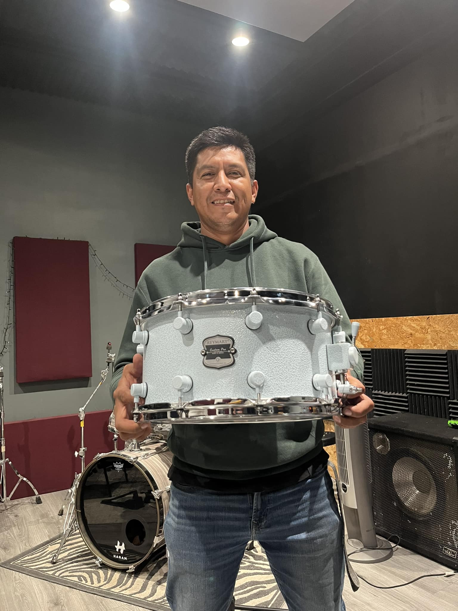 Para su primera tarola Reymart, buscaba algo único. Eligió una tarola de aluminio en acabado high gloss color Pure Tone, con hardware de latón y dos salidas de aire grandes, pensada para ofrecer un sonido poderoso y profesional, ideal tanto para grabaciones como para presentaciones en vivo.